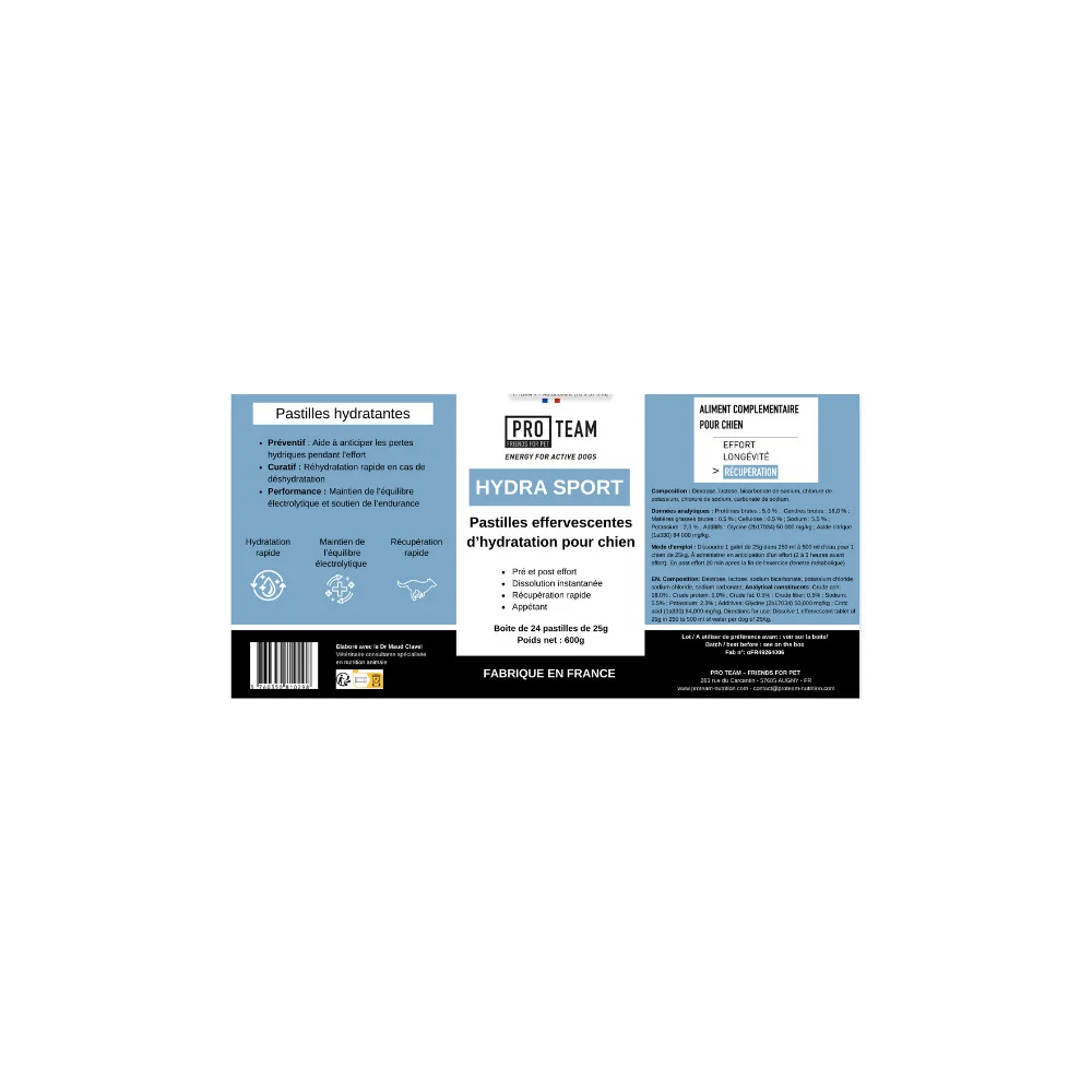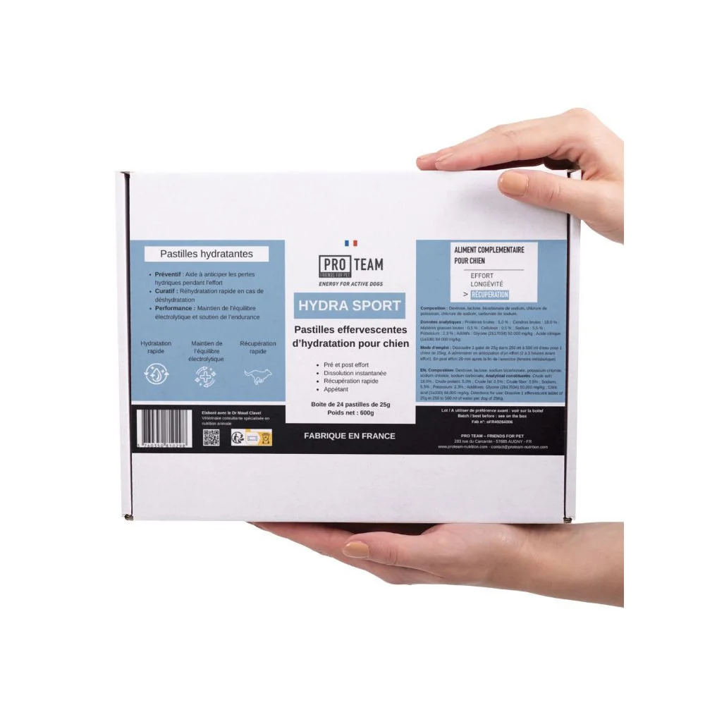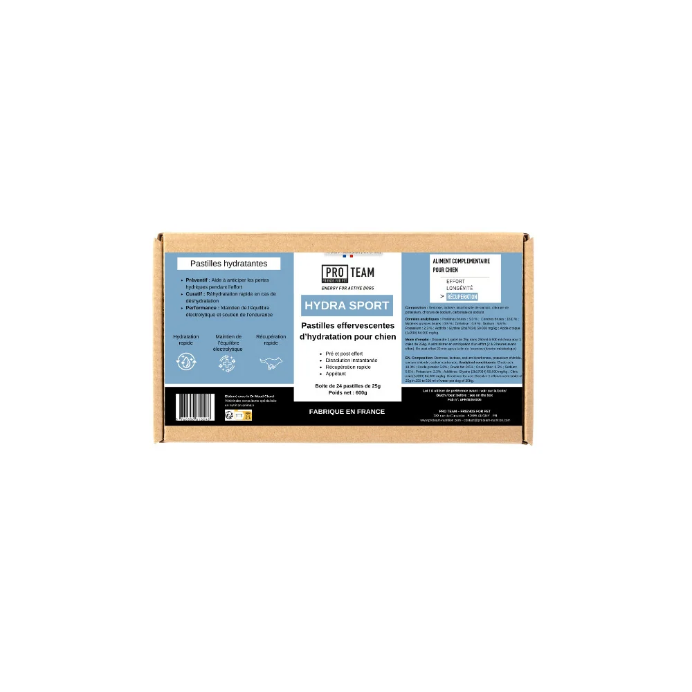 PRO TEAM HYDRA SPORT est une solution d’hydratation avancée sous forme de pastille effervescente, formulée pour accompagner les chiens sportifs avant, pendant et après l’effort. Développée en collaboration avec la vétérinaire nutritionniste Dr Maud Clavel, cette boisson offre un apport optimisé en électrolytes et en énergie rapide grâce au dextrose.